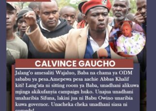 Gaucho lectures and exposes Jalang’o-Jalang’o amesaliti Wajaluo, Baba na chama ya ODM sababu ya pesa.Amepewa pesa aachie Abbas Khalif kiti! Lang’ata ni sitting room ya Baba, unadhani alikuwa mjinga akikufanyia campaign huko.