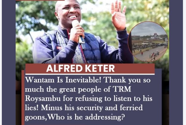 Akizungumza baada ya tukio lililofanyika katika eneo la TRM Roysambu, Keter aliwashukuru wakazi kwa kile alichodai ni kukataa “kusikiliza uongo.” Katika ujumbe wake, alihoji hadhira halisi ya anayemkosoa, akisema kuwa bila ulinzi wake na watu wanaodaiwa kusafirishwa kuhudhuria mikutano, haijulikani ni nani angekuwa akihutubiwa.