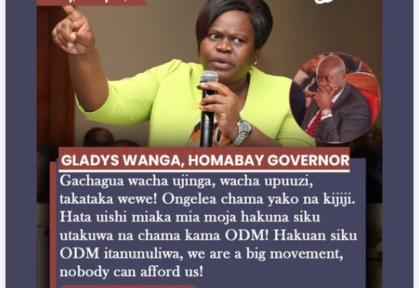 Homa Bay Governor Gladys Wanga has sharply responded to former Deputy President Rigathi Gachagua in a fiery defense of the Orange Democratic Movement (ODM).