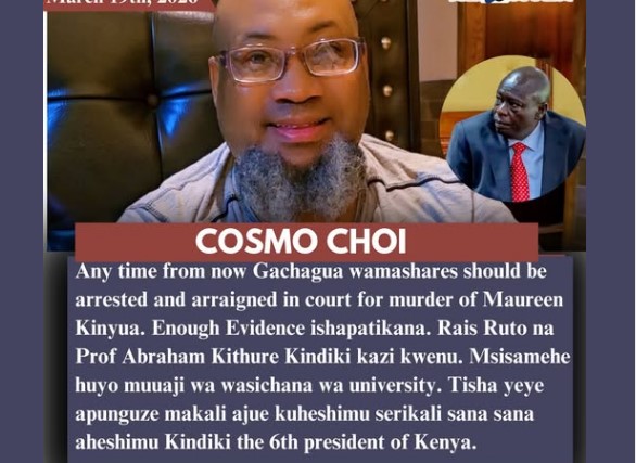 Prominent commentator Cosmo Choi has intensified public pressure on authorities, demanding the immediate arrest and prosecution of Gachagua and his associates in connection with the murder of university student Maureen Kinyua. Choi argues that sufficient evidence has already been gathered to justify legal action, calling on President William Ruto and Professor Abraham Kithure Kindiki to take decisive steps.