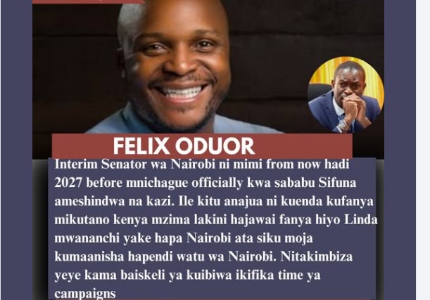 “Interim Senator wa Nairobi ni mimi from now hadi 2027 before mnichague officially kwa sababu Sifuna ameshindwa na kazi.” Jalas declares to unseat Sifuna