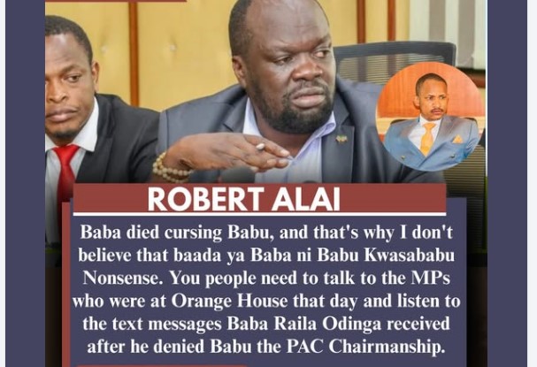 Akizungumza kwa ukali, Alai alisema kuwa hana imani na kauli ya “baada ya Baba ni Babu,” akidai kuwa mambo yaliyotokea ndani ya chama yanaeleza tofauti. Alidokeza kuwa kulikuwa na mvutano mkubwa wakati Babu aliponyimwa nafasi ya uenyekiti wa Kamati ya PAC, na kwamba baadhi ya wabunge waliokuwepo Orange House wanafahamu undani wa kilichotokea siku hiyo.