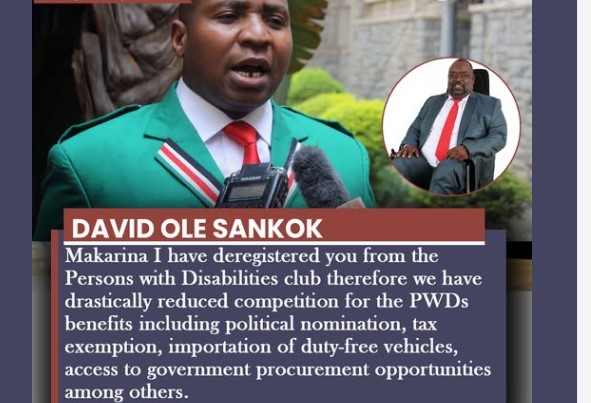 Mike Makarina has suffered a major political and social setback after Senator David Ole Sankok announced that he has been deregistered from the Persons with Disabilities (PWDs) club. According to Ole Sankok, Makarina will no longer enjoy the benefits or special treatment that comes with being recognized as disabled.