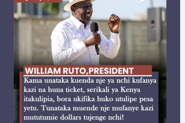 “Kama unataka kuenda nje ya nchi kufanya kazi na huna ticket, serikali ya Kenya itakulipia, bora ukifika huko utulipe pesa yetu. Tunataka muende nje mufanye kazi mututumie dollars tujenge nchi!”-President Ruto