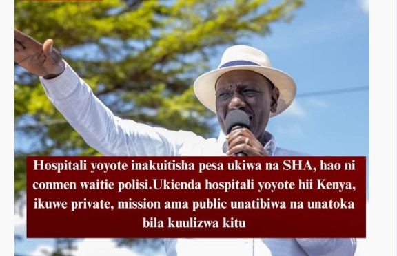 “Hospitali yoyote inakuitisha pesa ukiwa na SHA, hao ni conmen waitie polisi.” President Ruto declares