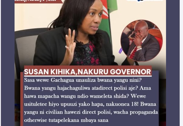 Nakuru Governor Susan Kihika has come out strongly to defend her husband following remarks attributed to former Deputy President Rigathi Gachagua. In a fiery response, Kihika questioned why her spouse was being dragged into political disputes, emphasizing that he holds no public office and therefore has no authority over state agencies. Addressing the matter publicly, […]