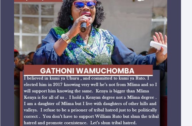 Gathoni Wamuchomba-I believed in kumi ya Uhuru , and committed to kumi ya Ruto. I elected him in 2017 knowing very well he’s not from Mlima and so I will support him knowing the same. Kenya is bigger than Mlima