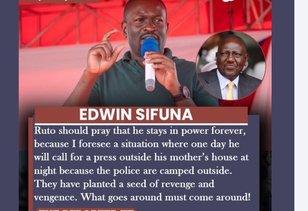 Sifuna’s chilling prophetic warning to Ruto-Ruto should pray that he stays in power forever, because I foresee a situation where one day he will call for a presser outside his mother’s house at night because the police are camped outside.