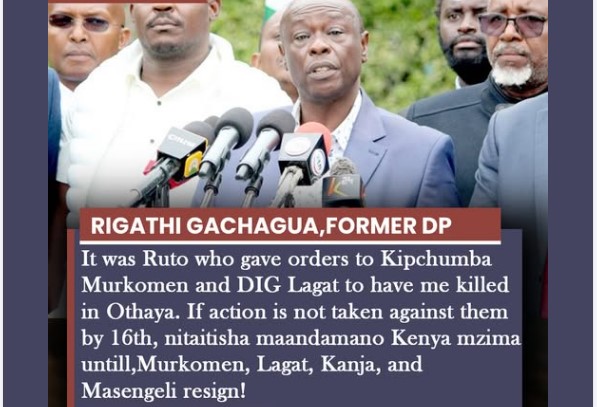 Former Deputy President Rigathi Gachagua has made serious allegations against President William Ruto, Interior Cabinet Secretary Kipchumba Murkomen, and senior police officials, claiming there was a plot against his life. Speaking during a public address, Gachagua alleged that orders were issued to target him during a recent event in Othaya. He called for investigations and […]