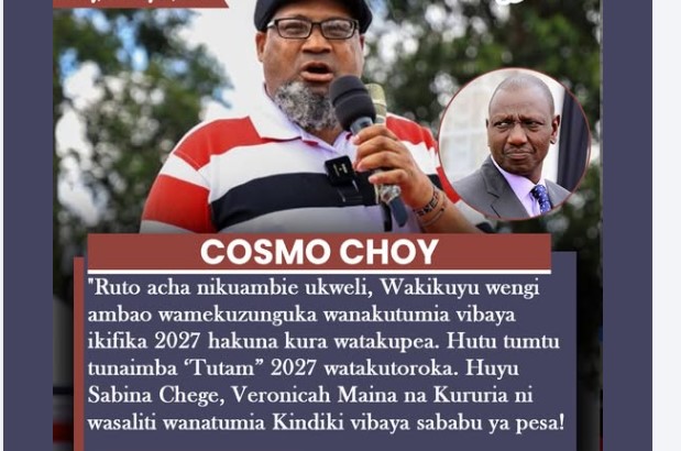 Cosmo Choy warns Ruto against Kikuyus-“Ruto acha nikuambie ukweli, Wakikuyu wengi ambao wamekuzunguka wanakutumia vibaya ikifika 2027 hakuna kura watakupea. Hutu tumtu tunaimba ‘Tutam” 2027 watakutoroka.