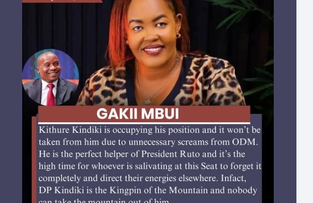Gakii Mbui has voiced strong support for Deputy President Kithure Kindiki, describing him as the undisputed political kingpin of the Mt Kenya region.