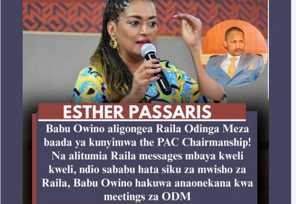 Nairobi Woman Representative Esther Passaris amezua mjadala mkali baada ya kudai kuwa Mbunge wa Embakasi Mashariki, Babu Owino, aliwahi kuonyesha hasira kali baada ya kunyimwa nafasi ya uenyekiti wa Kamati ya PAC.