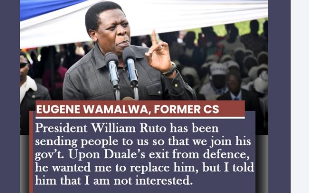 “President William Ruto has been sending people to us so that we join his government. Upon Duale’s exit from Defence, he wanted me to replace him, but I told him that I am not interested,” Wamalwa said.