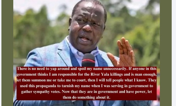 Former Interior Cabinet Secretary Dr. Fred Matiang’i has issued a bold challenge to the current administration, accusing government officials of tarnishing his name with unfounded allegations linking him to the infamous River Yala killings. In a fiery statement, Matiang’i said there is no need for government leaders to “yap around” and drag his name into political propaganda, daring them instead to summon him or take him to court if they believe he has anything to hide.
