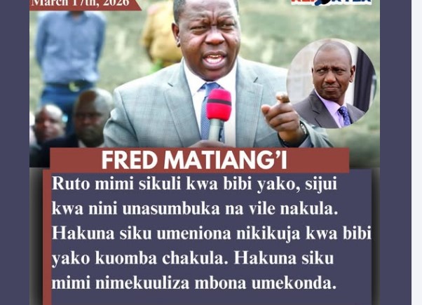Interior Cabinet Secretary Fred Matiang’i has publicly lashed out at President William Ruto in a heated exchange that has left many Kenyans talking. Speaking candidly, Matiang’i declared, “Ruto mimi sikuli kwa bibi yako, sijui kwa nini unasumbuka na vile nakula. Hakuna siku umeniona nikikuja kwa bibi yako kuomba chakula. Hakuna siku mimi nimekuuliza mbona umekonda.”