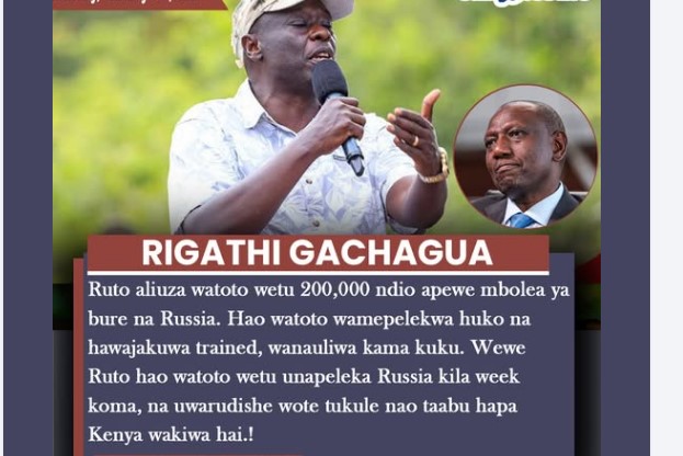 In early February 2026, former Deputy President Rigathi Gachagua, now leader of the Democracy for Citizens Party (DCP), drew strong reactions from Kenyans after he publicly criticised President William Ruto over what he described as the mistreatment of Kenyan youths sent abroad. Speaking at a traditional ruracio (dowry) ceremony in Gatundu South, Kiambu County, Gachagua accused the government of encouraging young people to seek jobs in Russia but ending up exposing them to dangerous conditions instead of real employment opportunities. He claimed that many went with the expectation of factory or driving jobs but were allegedly drawn into military service without proper training, leading to injuries and deaths in the ongoing Russia‑Ukraine conflict. He argued the government should bring these young Kenyans home alive rather than risk their lives in foreign hostilities.