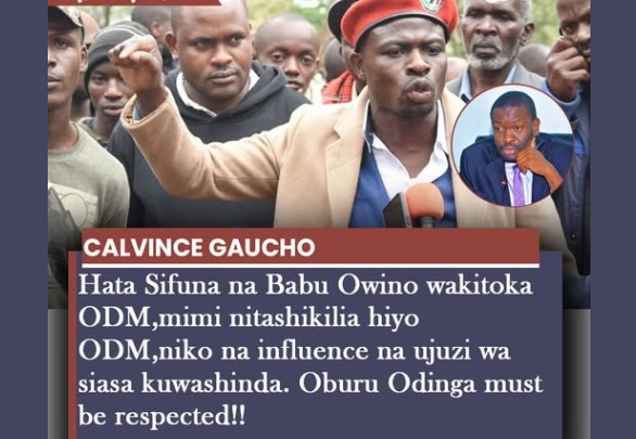 In essence, Gaucho’s statement is both a declaration of loyalty and a warning. It affirms unwavering commitment to ODM while cautioning against politics driven by ego and factionalism. By stressing respect, influence, and political knowledge, Gaucho frames himself as a custodian of party values at a time when ODM faces internal pressure and generational transition.