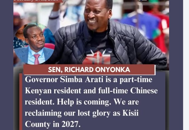 In a fiery statement, Onyonka claimed that Arati is “a part-time Kenyan resident and full-time Chinese resident,” suggesting that the governor spends too much time outside the country instead of focusing on local development.