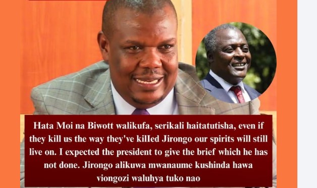 “Hata Moi na Biwott walikufa, serikali haitatutisha. Even if they kill us the way they’ve killed Jirongo, our spirits will still live on. I expected the president to give the brief which he has not done. Jirongo alikuwa mwanaume kushinda hawa viongozi. Waluhya tuko nao,” Wamboka said.