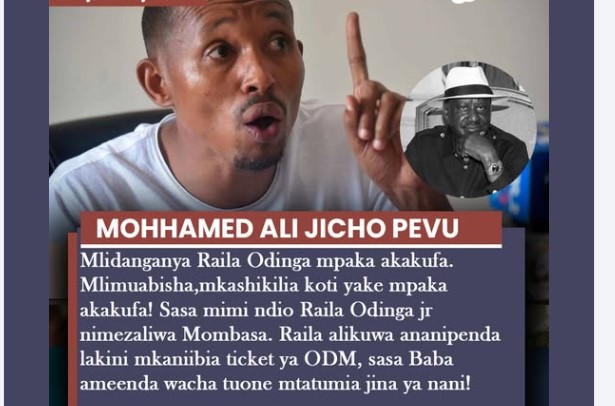 In a bold declaration, Jicho Pevu described himself as “Raila Odinga Jr. born in Mombasa,” positioning himself as the rightful torchbearer of Raila’s legacy in the coastal region. He further alleged that he was unfairly denied an ODM ticket in the past, implying internal party politics may have worked against him despite his perceived closeness to the former Prime Minister.