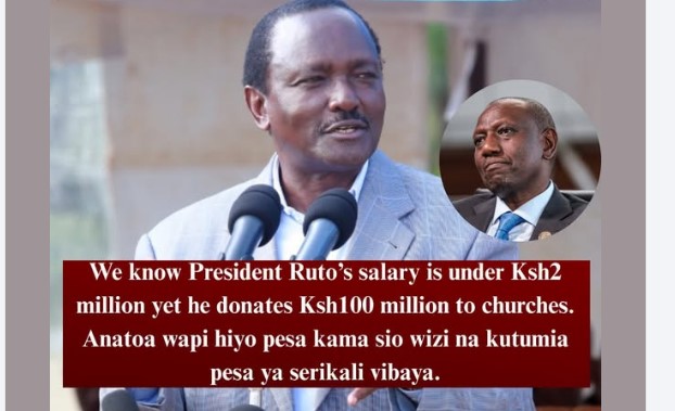 “We know President Ruto’s salary is under Ksh2 million, yet he donates Ksh100 million to churches. Anatoa wapi hiyo pesa kama sio wizi na kutumia pesa ya serikali vibaya,” Musyoka stated, implying that the donations could be linked to state resources rather than personal wealth.