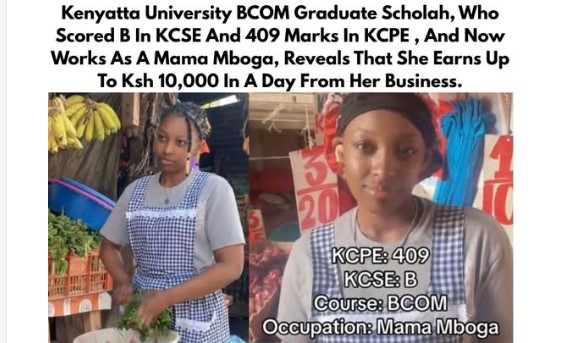 Ultimately, the story of the Kenyatta University BCOM graduate turned mama mboga forces Kenyans to confront uncomfortable truths about education, employment, and pride. It reminds society that success is not linear, and that honest work—regardless of form—can be both dignified and financially empowering in today’s economy.