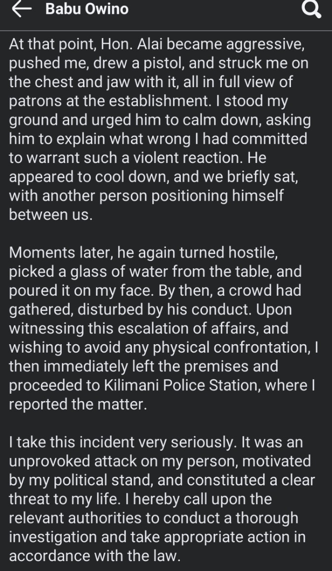 Babu Owino has broken his silence following concerning reports of shocking incident where Robert Alai allegedly pulled out his gun and threatened to shoot him at a Nairobi Restaurant.