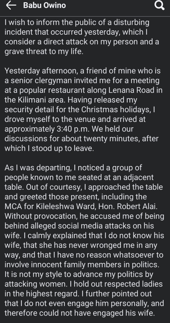 Babu revealed that he reported the matter at Kilimani Police Station. He called on leaders to set a good example for the society by avoiding such physical confrontations which may lead to loss of lives.