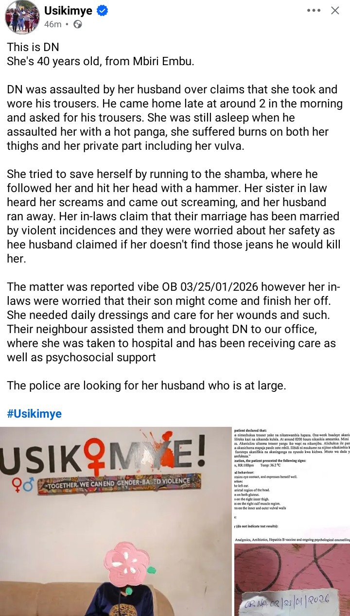 The incident was reported under OB 03/25/01/2026; however, her in-laws feared that their son might return to harm Faith again. She required daily dressings and care for her injuries. A neighbor helped them by bringing Faith to the Usikimye office, where she was taken to the hospital for treatment and received psychosocial support.