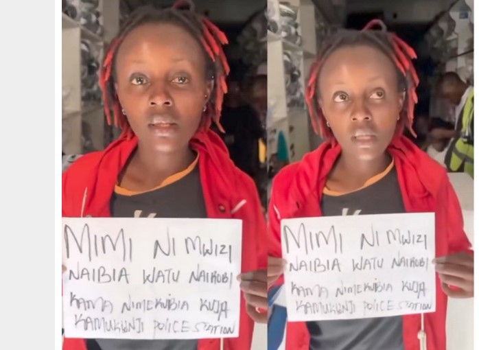 A young woman suspected of engaging in street-level theft was apprehended on Tuesday after members of the public detained her, sparking widespread attention online. A video circulating on Facebook and X shows the woman holding handwritten confession notes while apparently awaiting transfer to Kamukunji Police Station.