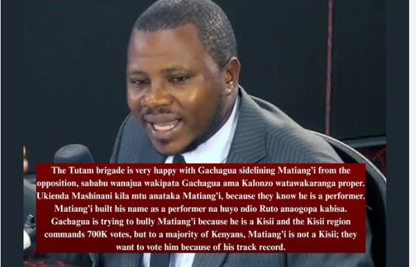 "Mkileta Gachagua ama Kalonzo, Ruto atawakaranga vibaya! Ruto fears Matiang'i only person he can defend his track record"~Chege Majuice -