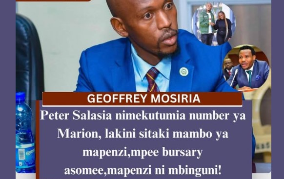 According to Mosiria, he shared Marion’s contact details with Salasia strictly to facilitate educational assistance, not personal relationships. “Peter Salasia nimekutumia number ya Marion, lakini sitaki mambo ya mapenzi,” he stated, emphasizing that the goal was to help her access a bursary and continue her studies. He added pointedly, “Mpee bursary asomee, mapenzi ni mbinguni,” underscoring that love matters should not interfere with opportunities meant to uplift her future.