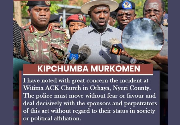 Elgeyo Marakwet Senator Kipchumba Murkomen has expressed deep concern over the violent incident at Witima ACK Church in Othaya, Nyeri County, describing it as alarming and unacceptable. Murkomen urged the police to act swiftly, without fear or favour, and to ensure that those responsible for orchestrating or carrying out the attack are held accountable, regardless of their social standing or political connections.