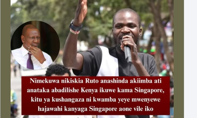 Controversial political activist and Raila Odinga’s diehard supporter Nuru Okanga has once again attacked President William Ruto, questioning his credibility after the Head of State promised to transform Kenya into a nation similar to Singapore.