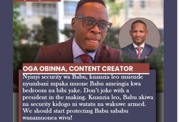 Popular media personality Oga Obinna has sparked discussion after issuing a strong public message directed at Embakasi East MP Babu Owino’s security team, urging them to take the legislator’s safety more seriously.