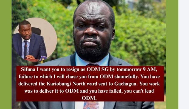 Robert Alai tells Sifuna-"Sifuna I want you to resign as ODM SG by tommorrow 9 AM, failure to which I will chase you from ODM shamefully. You have delivered the Kariobangi North ward seat to Gachagua." -