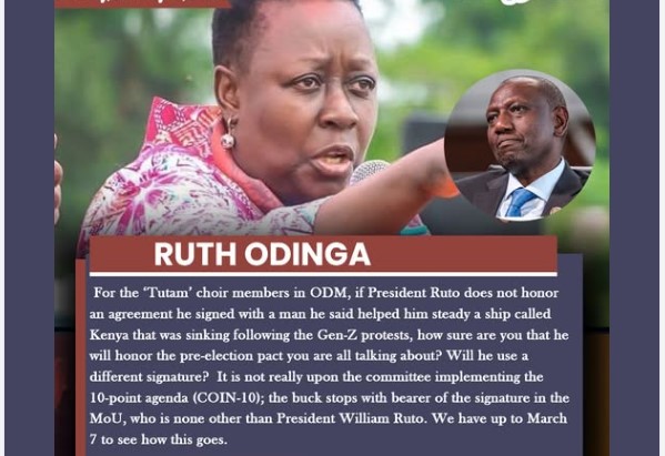 Ruth further noted that the responsibility does not lie with the committee tasked with implementing the 10-point agenda (COIN-10). “The buck stops with the bearer of the signature in the MoU, who is none other than President William Ruto,” she emphasized. She also indicated that the matter’s outcome will be clearer by March 7, suggesting that the public and political observers should wait until then to see how the agreements unfold.