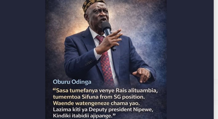 Sasa tumefanya venye Rais alituambia, tumemtoa Sifuna from SG position. Waende watengeneze chama yao. Lazima kiti ya Deputy President Nipewe, Kindiki itabidi ajipange, Oburu stated, emphasizing that the party is now focusing on the allocation of the Deputy President position and asserting his authority in shaping party decisions.