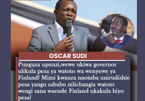 Sudi claimed that while serving as governor, Mandago “ate” money contributed by parents and well‑wishers to support students, arguing that the scheme betrayed families who sacrificed heavily for their children’s education. He went as far as demanding a refund, saying he personally contributed funds to help many students travel to Finland, only for the programme to collapse amid controversy.