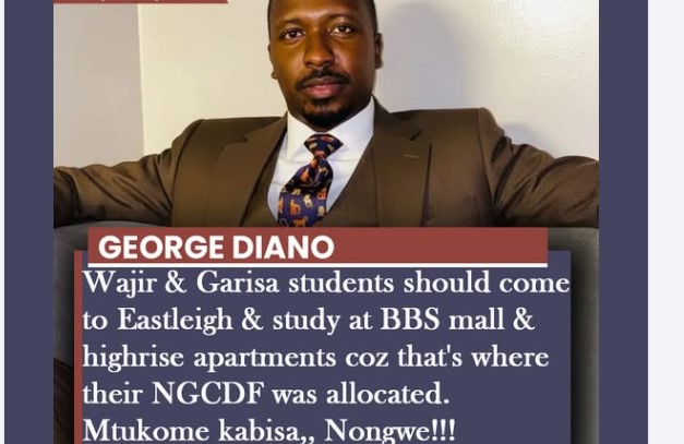 George Diano recently sparked debate with remarks suggesting that students from Wajir and Garissa should study in Eastleigh, where their NGCDF (National Government Constituency Development Fund) allocations have been directed. His statement has attracted attention for the way it links educational funding to specific locations.