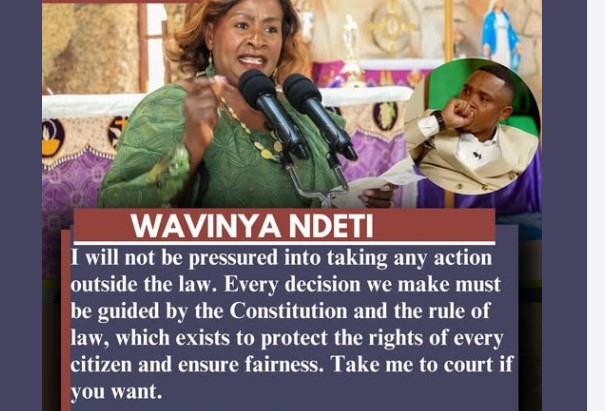 Governor Wavinya Ndeti responded firmly to the allegations, emphasizing her commitment to legality and due process. She told Kioko that she would not be pressured into taking any action outside the boundaries of the law. “Every decision we make must be guided by the Constitution and the rule of law, which exists to protect the rights of every citizen and ensure fairness. Take me to court if you want,” she stated.