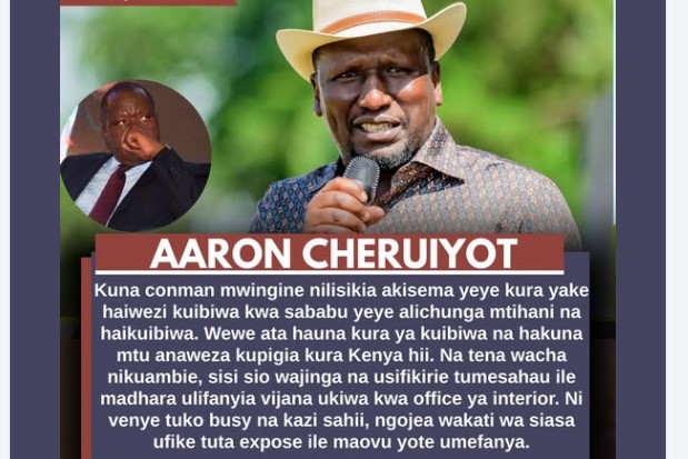 Akizungumza katika mkutano wa kisiasa, Cheruiyot alimkosoa vikali Matiang’i akisema hana ushawishi wa kisiasa na kwamba hakuna mtu anayeweza kumpigia kura katika uchaguzi wa Kenya. “Wewe ata hauna kura ya kuibiwa na hakuna mtu anaweza kupigia kura Kenya hii,” alisema.